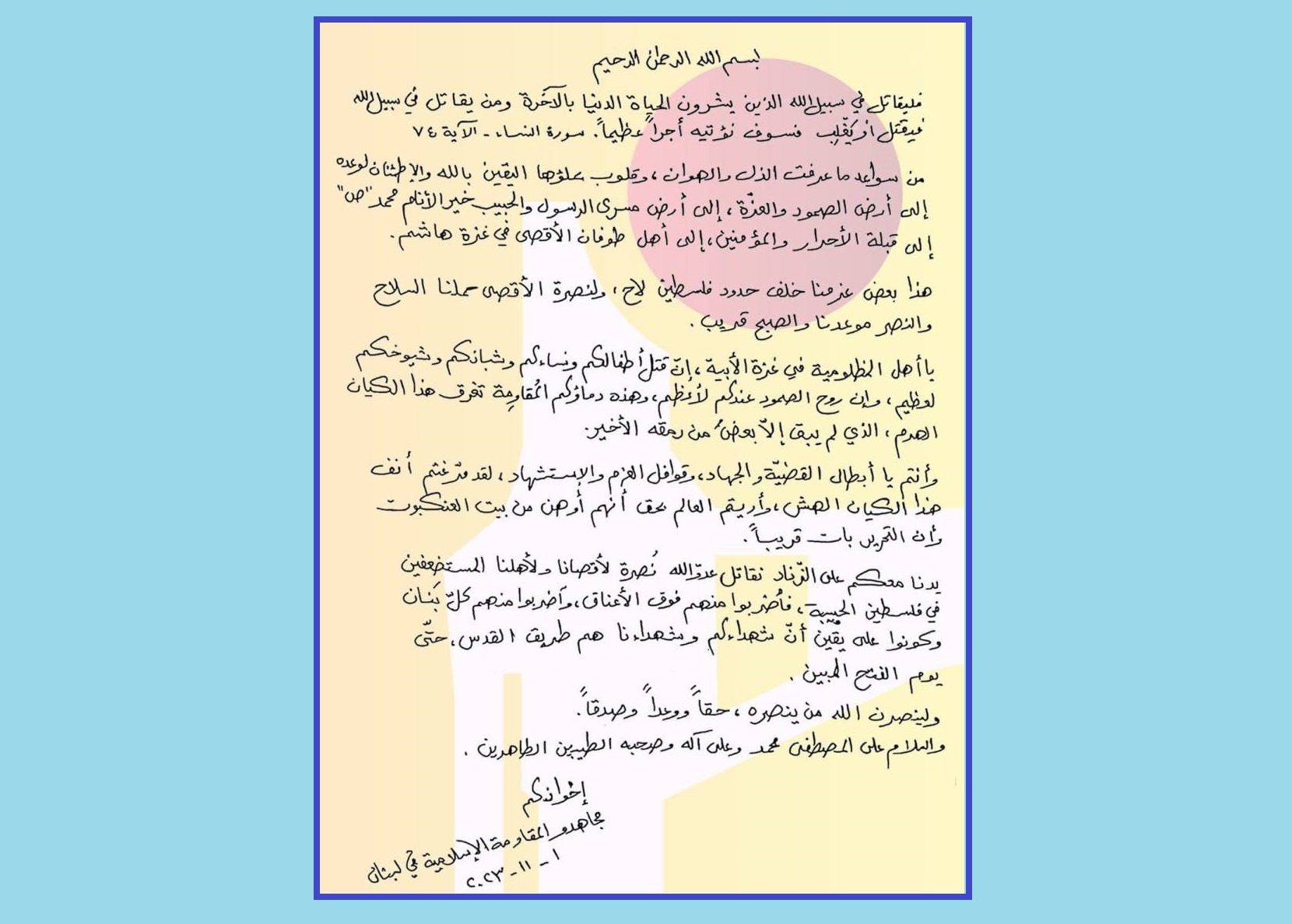 Паёми муҷоҳидини муқовамати исломии Лубнон (Ҳизбуллоҳ) ба муҷоҳидони шуҷоъи муқовамат дар навори Ғазза ва саросари Фаластини ишғолӣ: